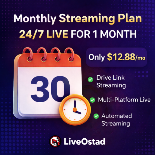 LiveOstad Monthly Live Subscription (30 Days) — 24/7 Live Streaming from Your Video Link ($12.88/mo)